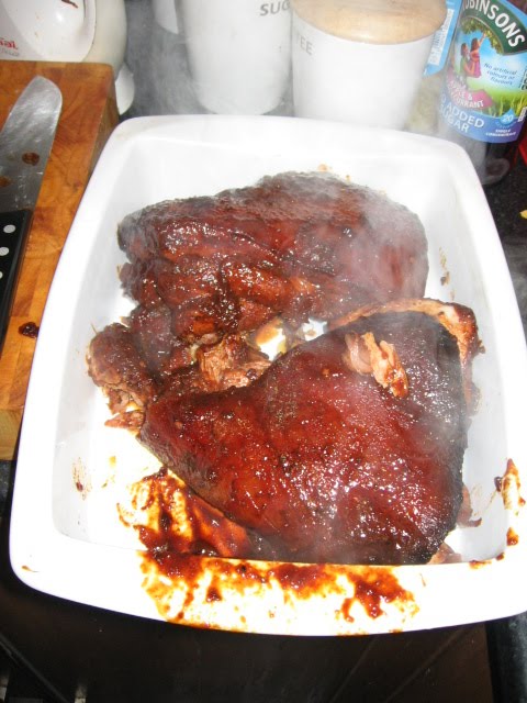 Take the ham out of the oven and turn the oven up to 220 C. Carefully strip the outer skin off the ham and then score the fat (not the meat) in a criss-cross pattern (see piccy above).